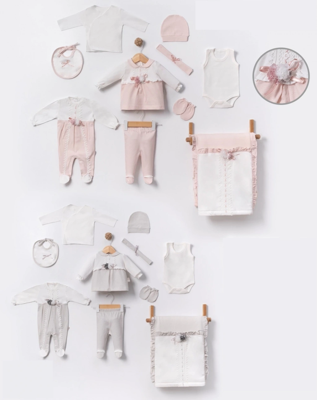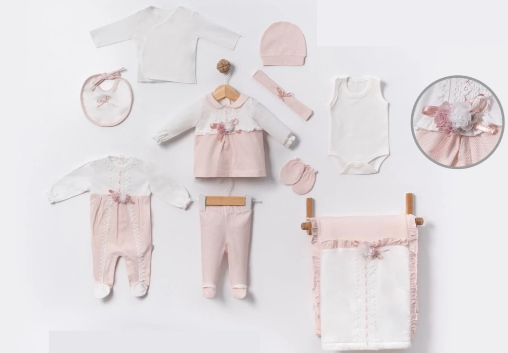 Lamato Baby markasının özel tasarımı olan Çiçek Aksesuarlı Dantelli Hastane Çıkışı Bebe 10'lu Set, yeni doğan bebekleriniz için şıklık ve konforu bir arada sunuyor.