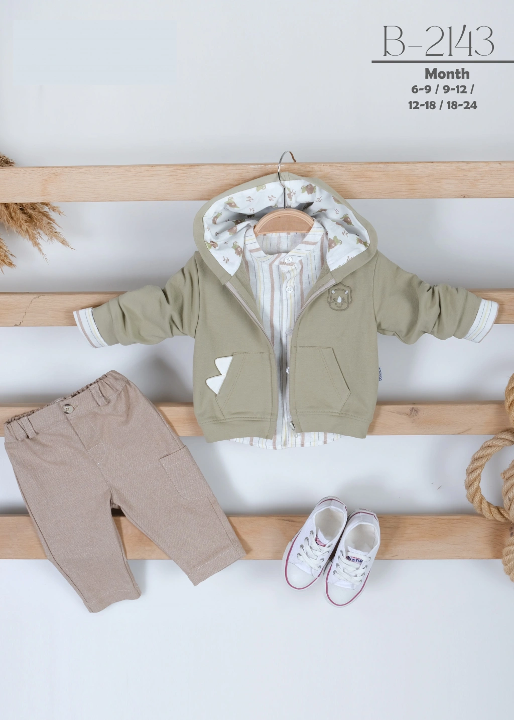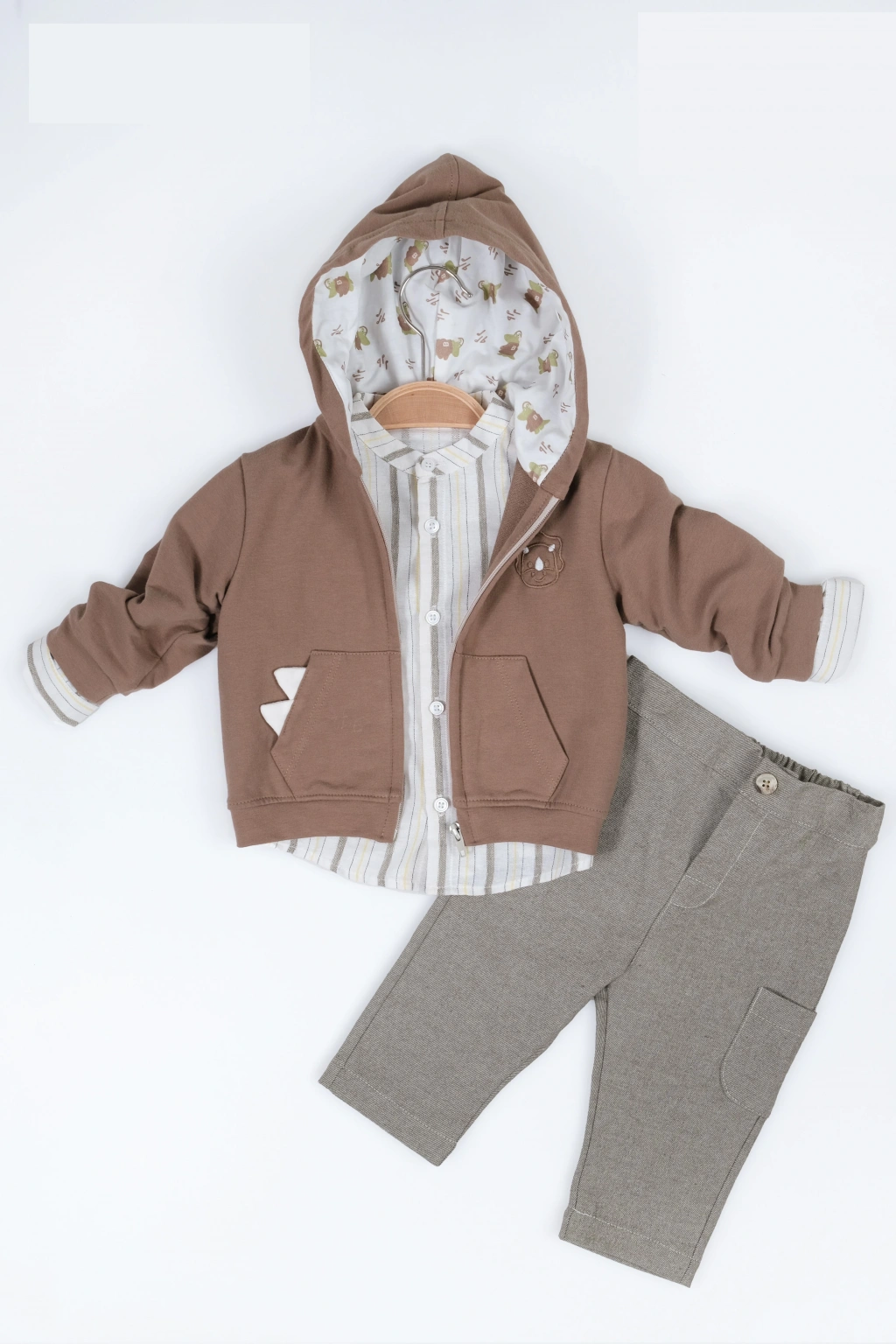 Lamato Baby markasının Dino Nakışlı Hırkalı Erkek Bebek 3'lü Takımı, bebeğinizin şıklığını ve konforunu bir arada sunuyor.
