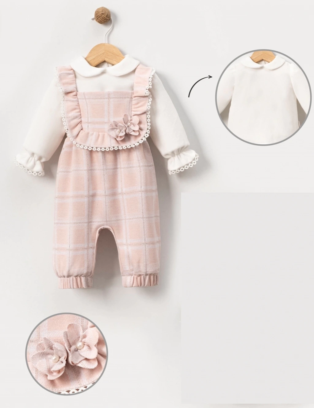 Lamato Baby markasının şirin tasarımlarından biri olan EKoşE SALOPET Çiçek Aksesuarlı Badılı Bebe Kız Tulum, minik prensesler için ideal bir seçimdir.