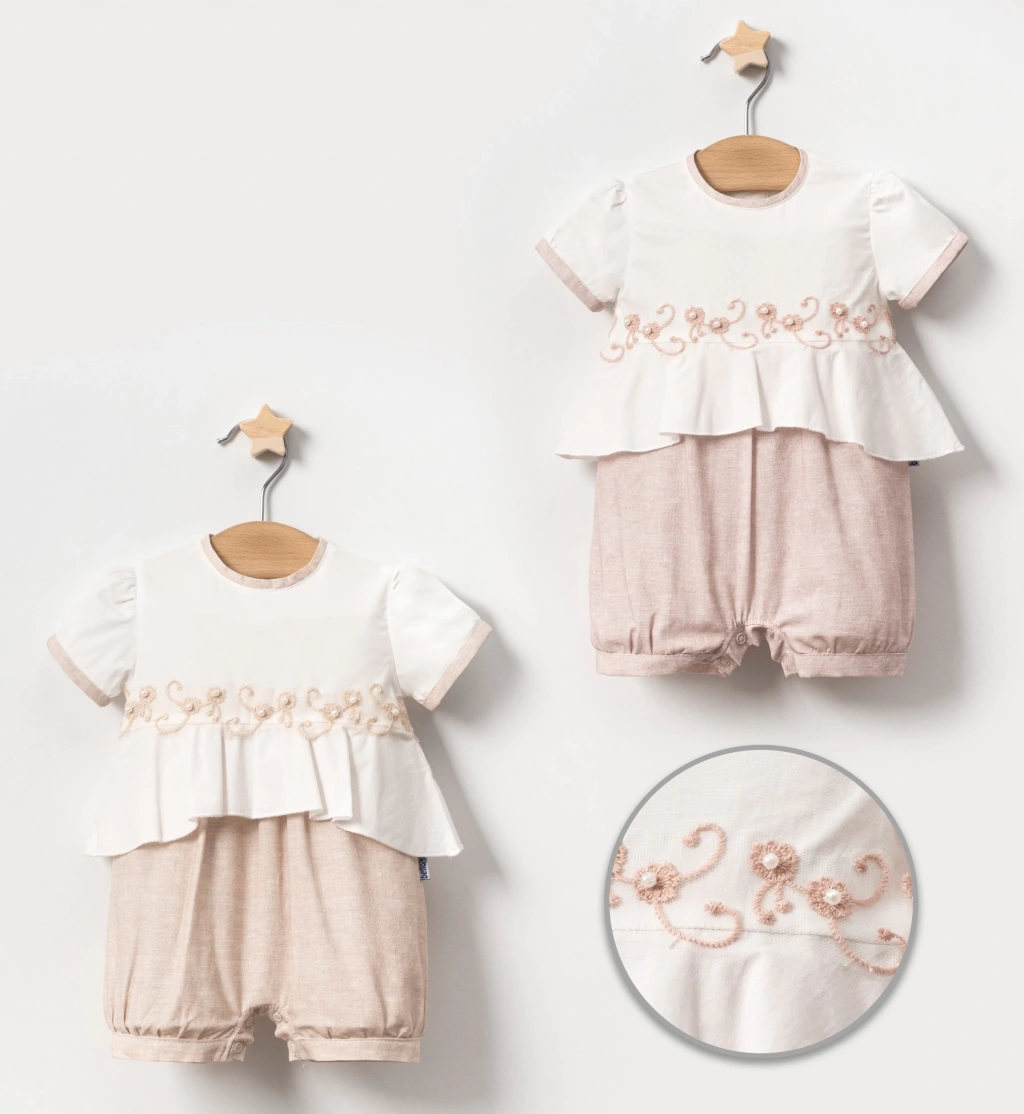 Yaz aylarının vazgeçilmezi olan Lamato Baby marka brodeli incili bebe kız tulum ile minik prensesiniz için şıklığı ve rahatlığı bir arada sunabilirsiniz.