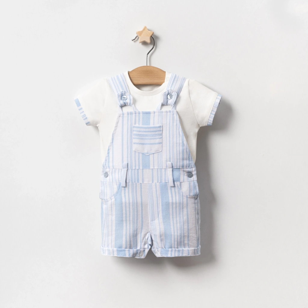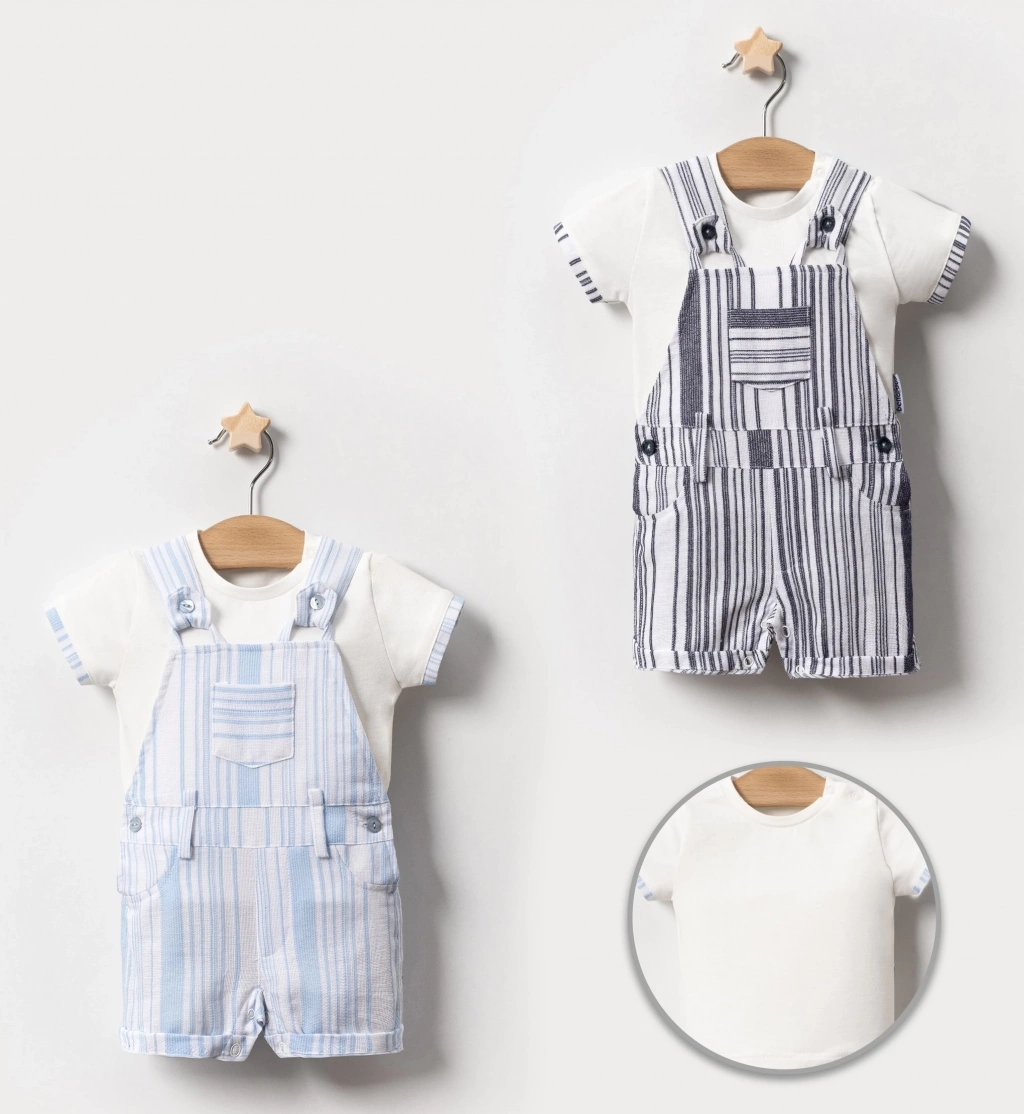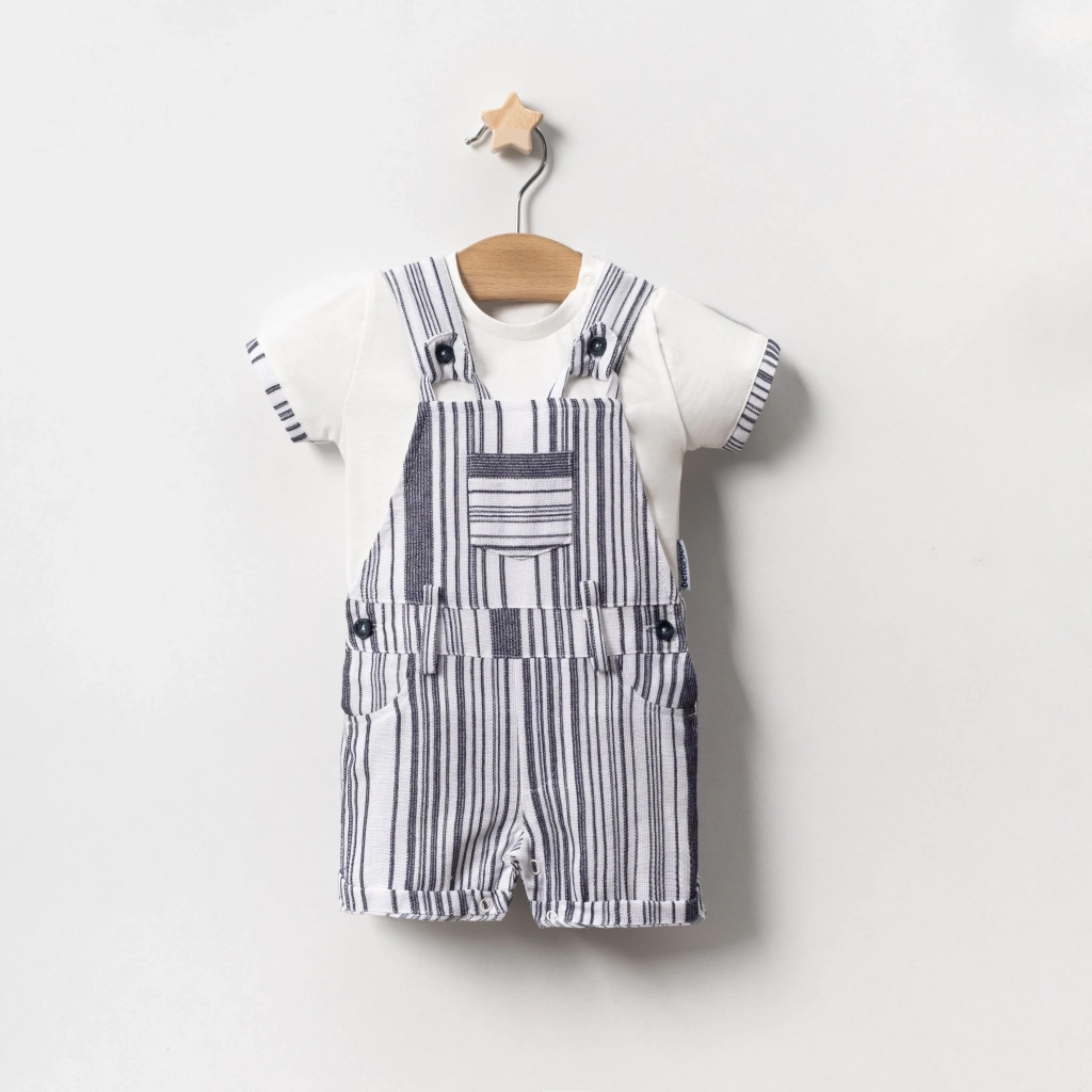 Lamato Baby markasının yazlık çizgili salopet cepli bebe erkek 2 parça tulumu, küçük erkek bebeklerin yaz aylarında rahatça giyebileceği şık ve konforlu bir seçenektir.