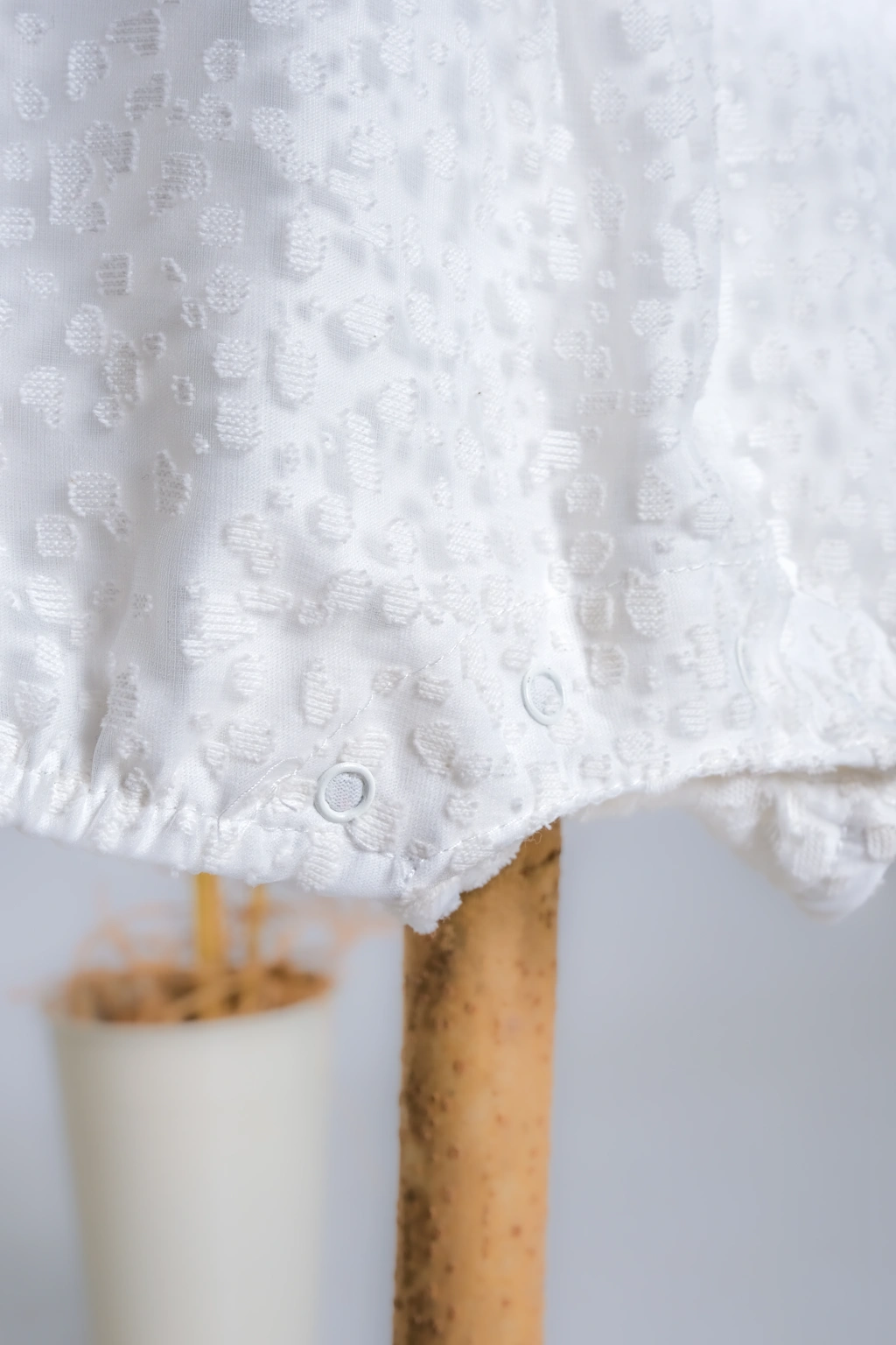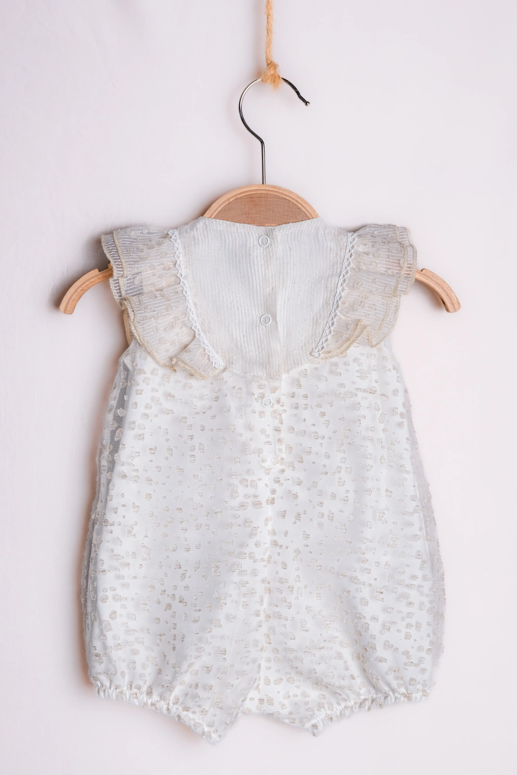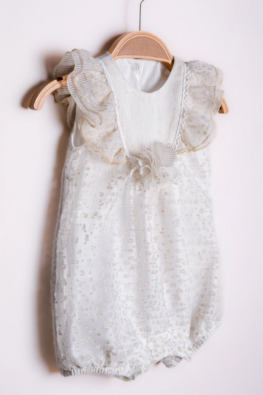 Lamato Baby'nin yaz aylarının vazgeçilmezi olan nokta desenli tüllü aksesuarlı bebek kız tulumu, şıklığı ve rahatlığı bir arada sunuyor.