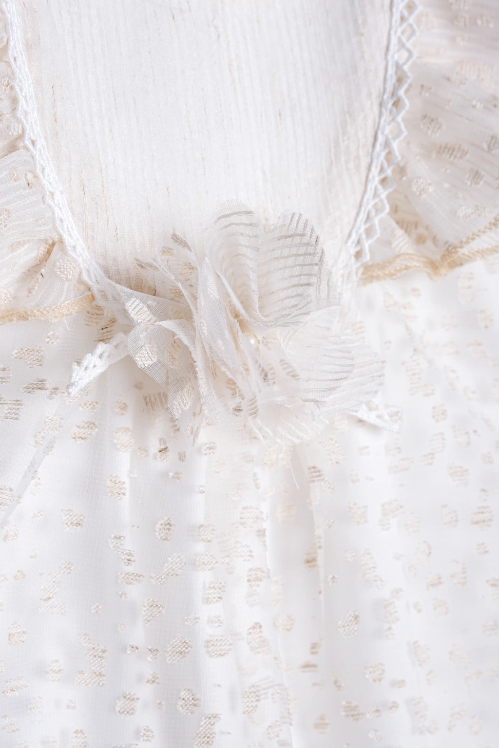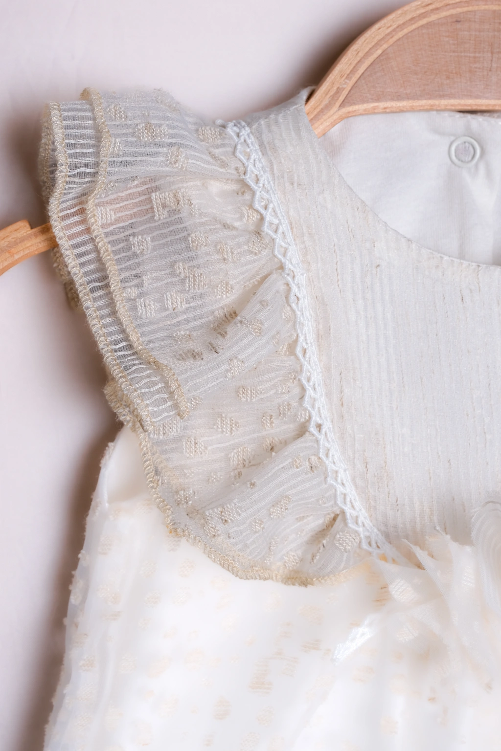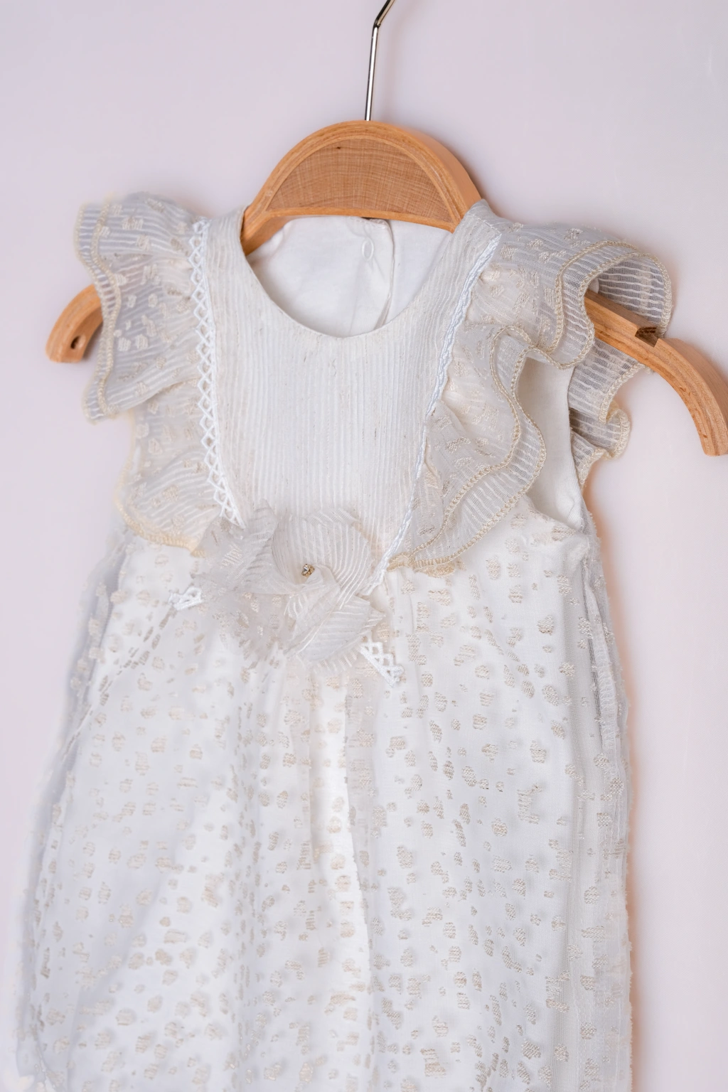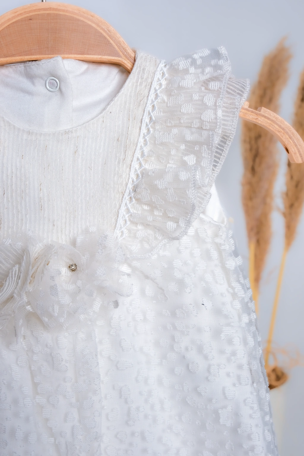 Lamato Baby'nin yaz aylarının vazgeçilmezi olan nokta desenli tüllü aksesuarlı bebek kız tulumu, şıklığı ve rahatlığı bir arada sunuyor.