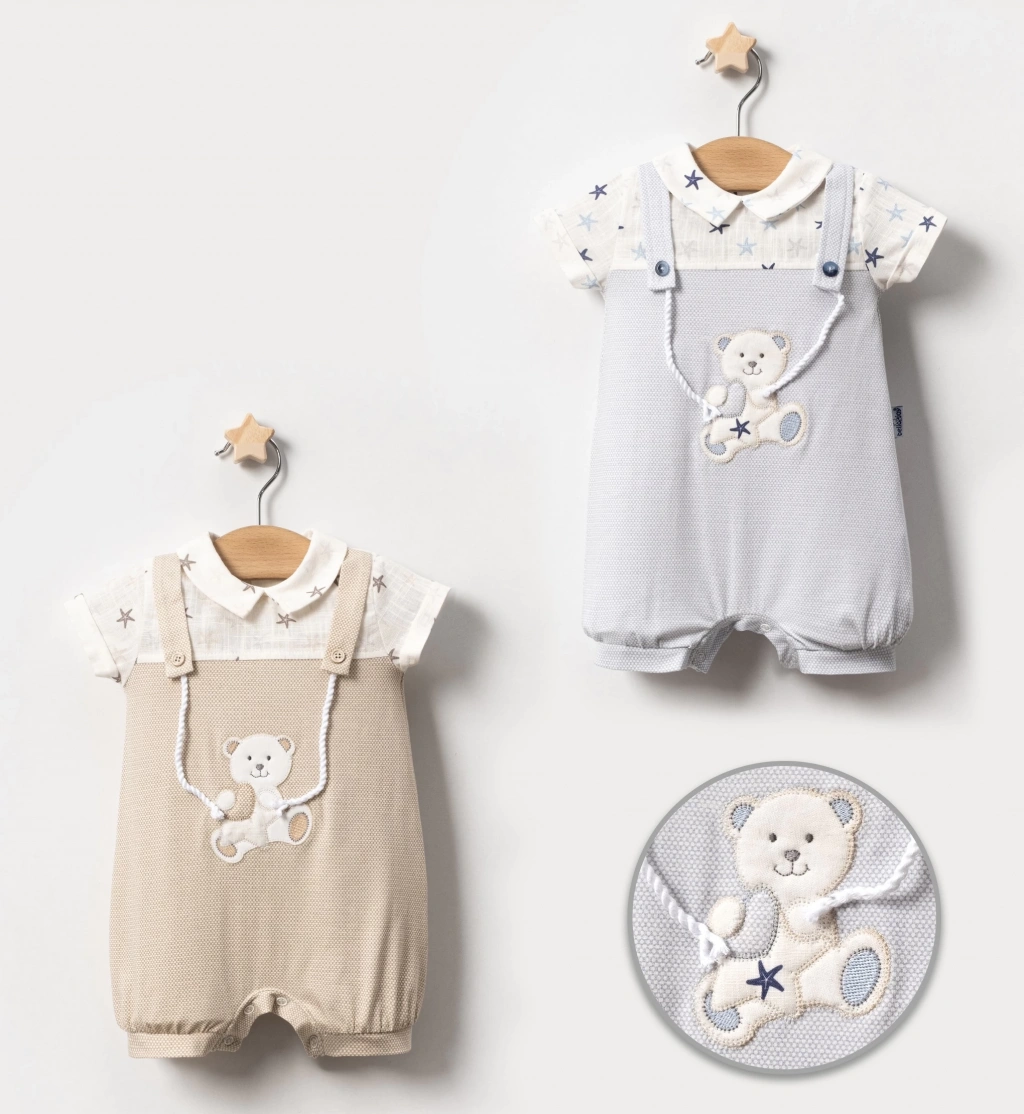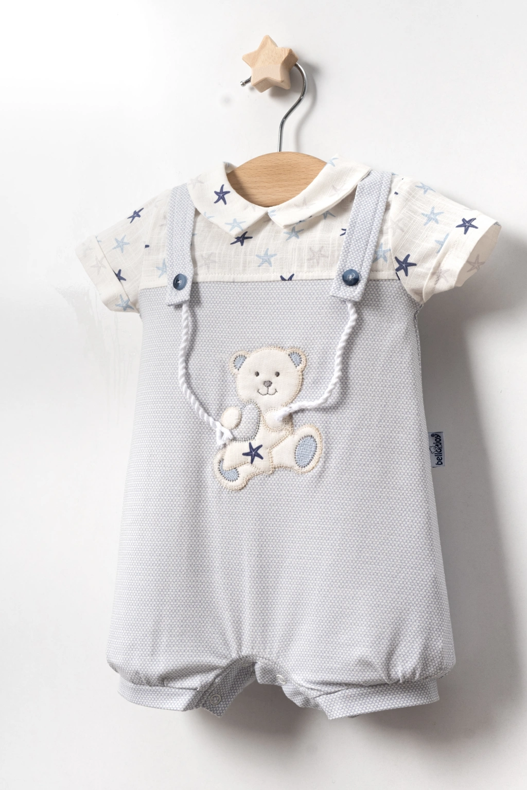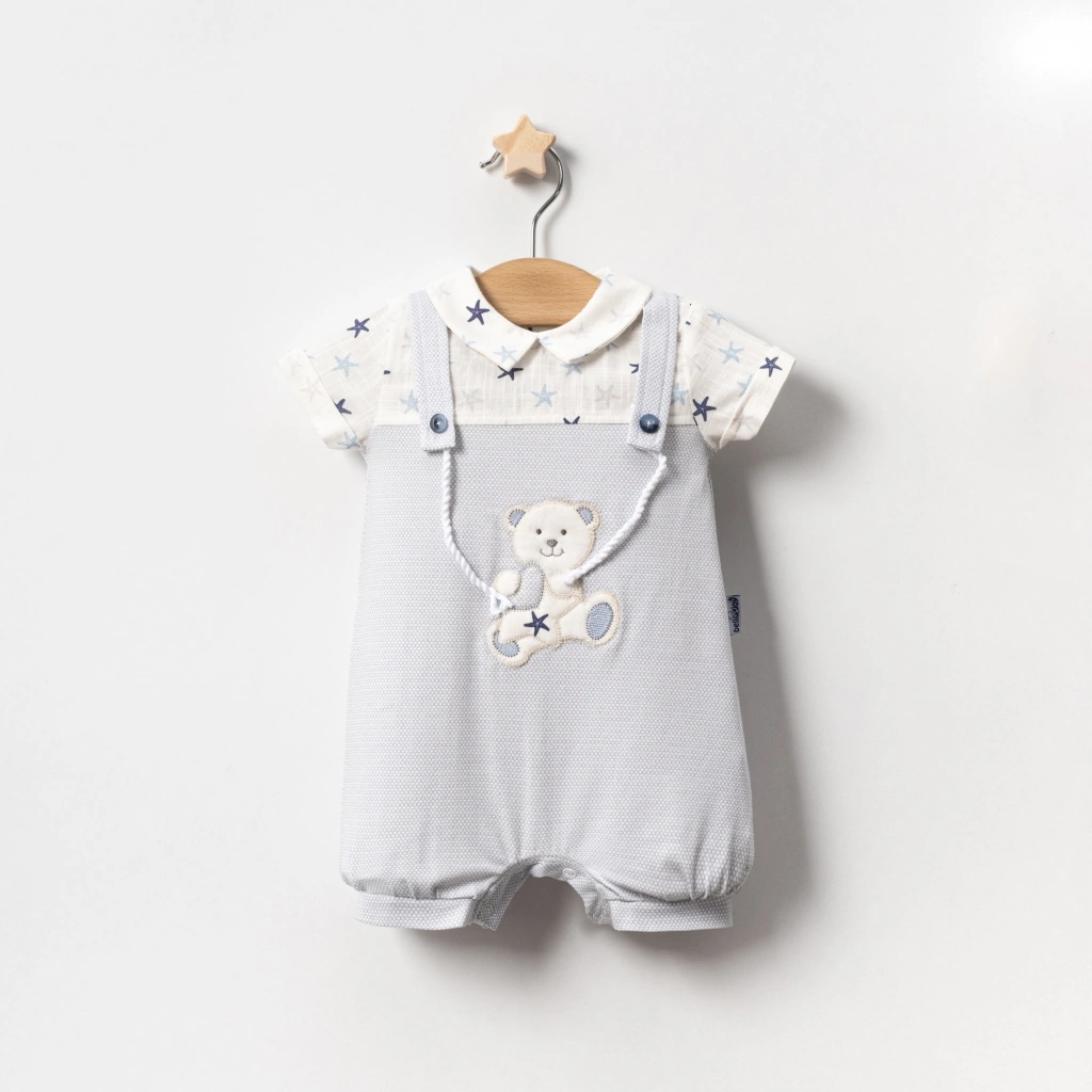 Lamato Baby markasının yazlık yıldız baskılı ayıcık nakışlı ipli bebek erkek tulumu, küçük prensinize yaz aylarında şıklık katacak!